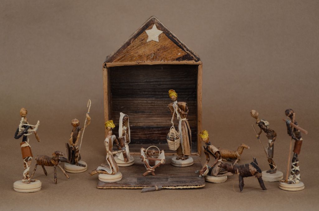 Made of dried banana leaves and other natural materials, purchased in Dullstroom, South Africa, 2016. The figures are made from bent wire with wood bases, which are then wrapped with fibers from the banana plant. The storage box forms the stable (8 inches tall). One of the kings swings an incense burner. One shepherd plays a flute, and another a lute. The unknown artist was able to capture the postures and gestures with such accuracy that these figures look like they could move when we look away.