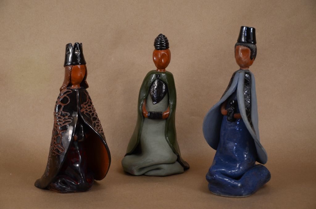 The designs on kings’ robes were created by pressing crocheted doilies into the wet clay; again, there has been selective use of clear glaze which brightens the colors and gives sheen. The tallest king is 11 inches high.