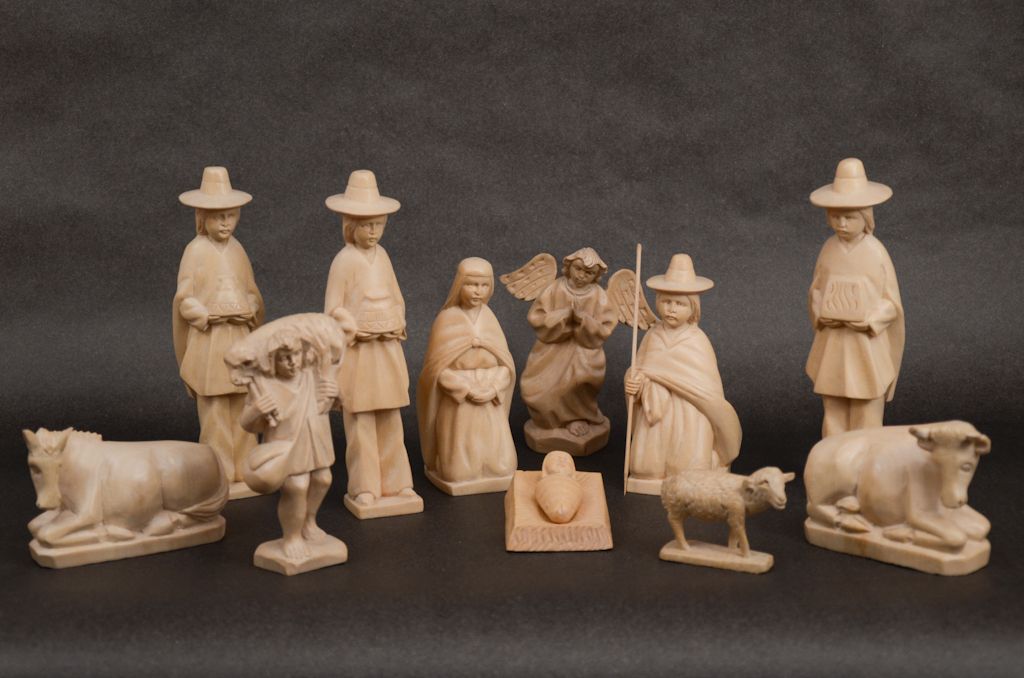 This set is finely carved of a light-toned wood, called naranjillo. All the figures are in traditional clothing with native faces. Mary has her hands clasp together on her abdomen (which is an unusual pose of the nativities that we own). Joseph and the kings wear Panama (paja toquilla) hats. The animals are extremely well carved. This Nativity was most likely carved by an artist from San Antonio de Ibarra, which is the most important wood-carving center in South America.