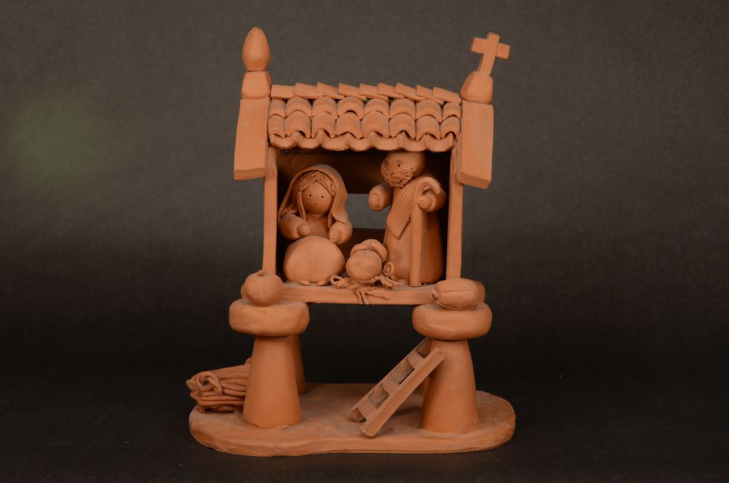 Hand-formed terracotta. Purchased in the Basque region of Spain near Santiago de Compostela, 1989. The Holy Family has been placed in an hórreo; 9 inches tall.