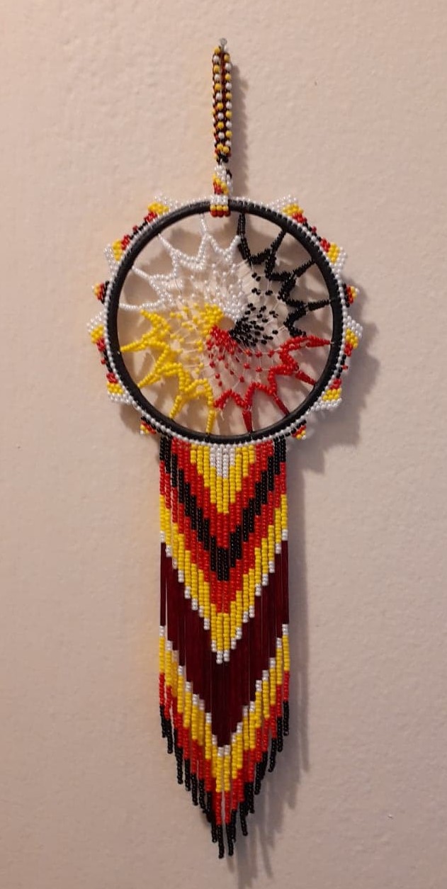 Dream catchers come from the Anishinaabe culture of the North American Great Lakes region. Originally considered a sacred object to protect infants from nightmares, dream catchers have come to be a popular handcraft over the past forty years, sometimes prompting ethical questions over whether such wide use and mass marketing constitutes cultural appropriation. This example uses beadwork to create a three-dimensional effect in the center hoop, as opposed to the traditional two-dimensional spider web design. It was created by a Sičháŋǧu (Brulé Sioux) artisan imprisoned in South Dakota. His work is available through the Pawnee Art Center in Dannebrog, Nebraska (managed by Gale Pemberton and folklorist Roger Welsch). The Center itself has been closed since devastating floods in 2019, but I can provide contact information on request.