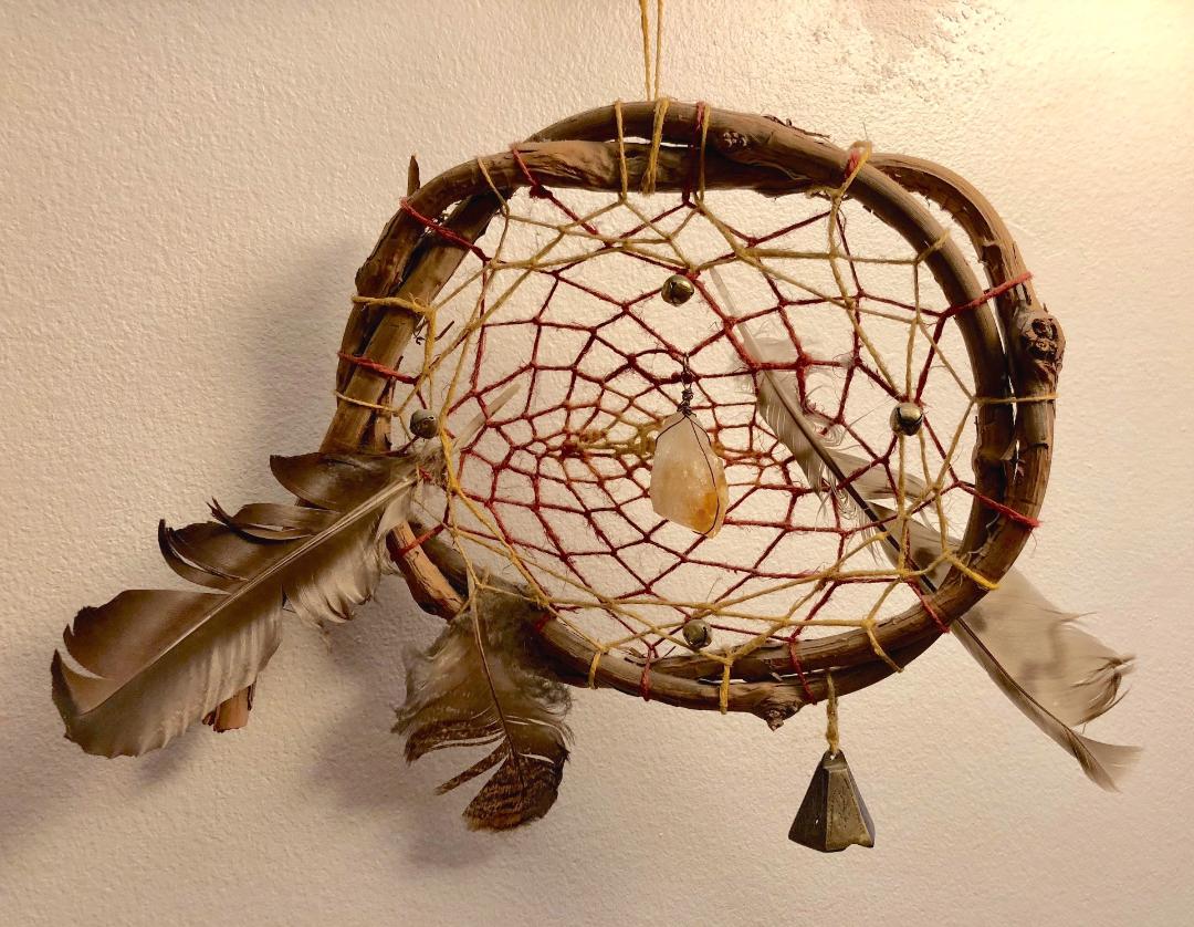 Dreamcatcher Upstate New York, late 1990s. Artist unknown. Dreamcatcher made of grapevine, feathers, bells, hemp string, and a Herkimer diamond quartz. (8” diameter)
